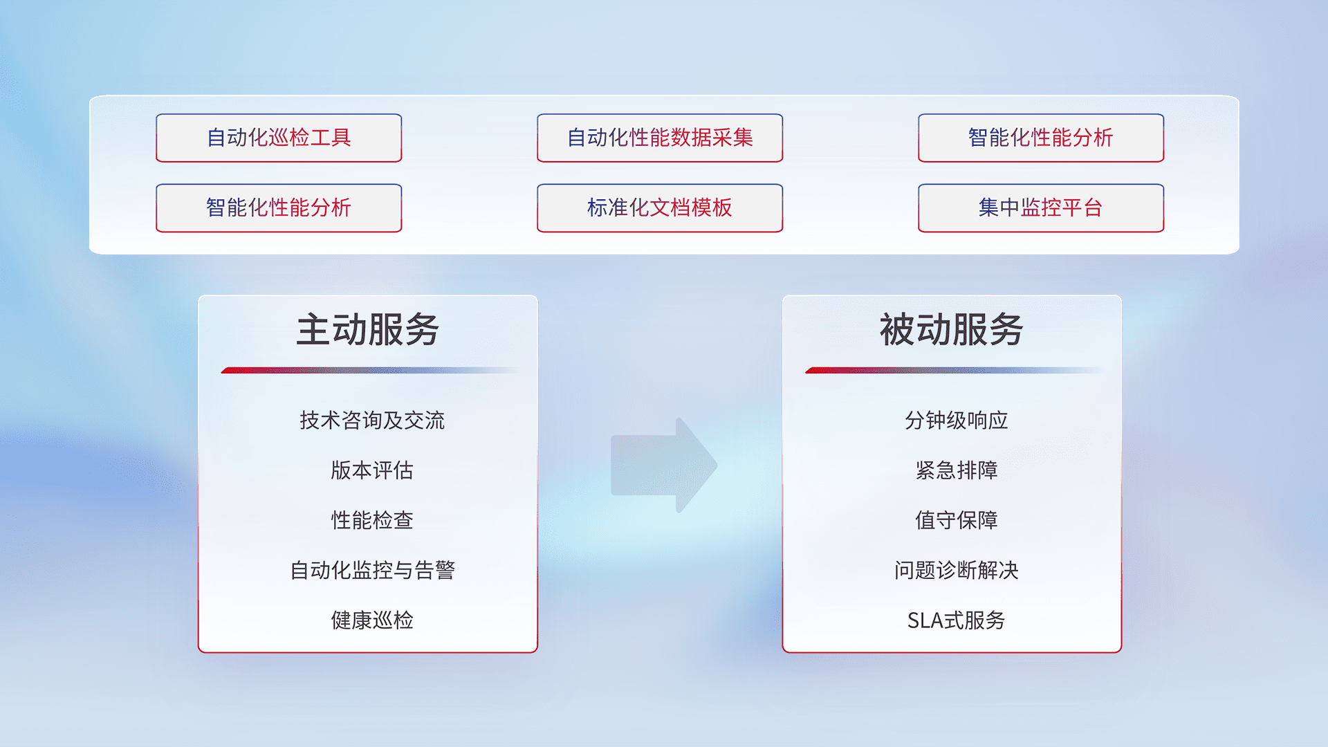 智能化工具和标准化文档,,保障服务质量,,,提供主动服务(包含技术咨询、、、、版本评估、、、性能检查、、、、自动化监控与告警、、、健康巡检)和被动服务包含(分钟级响应、、、紧急排障、、值守保障、、、、问题诊断解决、、、、SLA服务)。。。。